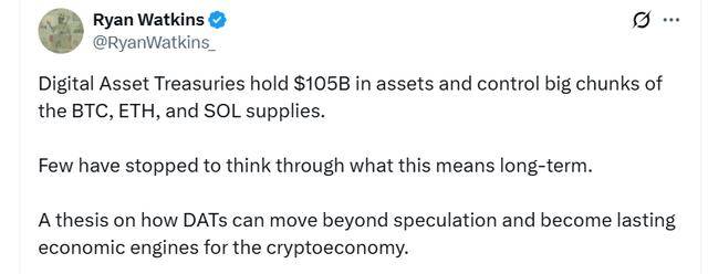 Watkins在一篇博客文章以及随后在X平台上发布的一条相关帖子中表示,DAT目前持有的比特币、以太币及其他主要加密货币资产总额约为1050亿美元,这一规模很少有市场参与者充分考虑过。