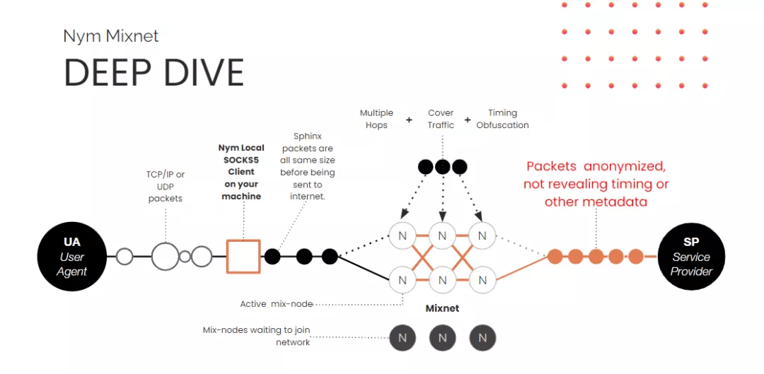 通过Nym网络的所有数据都是使用公钥加密技术进行层加密(或者换句话说,洋葱加密)的。为了防止窃听者监视特定大小的任何特定数据包,混合的第一步是将数据转换为统一大小的数据包——称为Sphinx数据包。然后,混合网络中的节点“混合”流量,以概率的方式释放数据包,以确保时间混淆,并避免任何基于数据何时进入或退出网络的跟踪尝试。