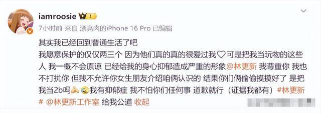 最让人啼笑皆非的是林更新那段“狗血剧”。司晓迪信誓旦旦地说是通过一位共同的女性朋友认识的林更新,结果这位女性朋友转眼就跟林更新好上了,把她给甩了。